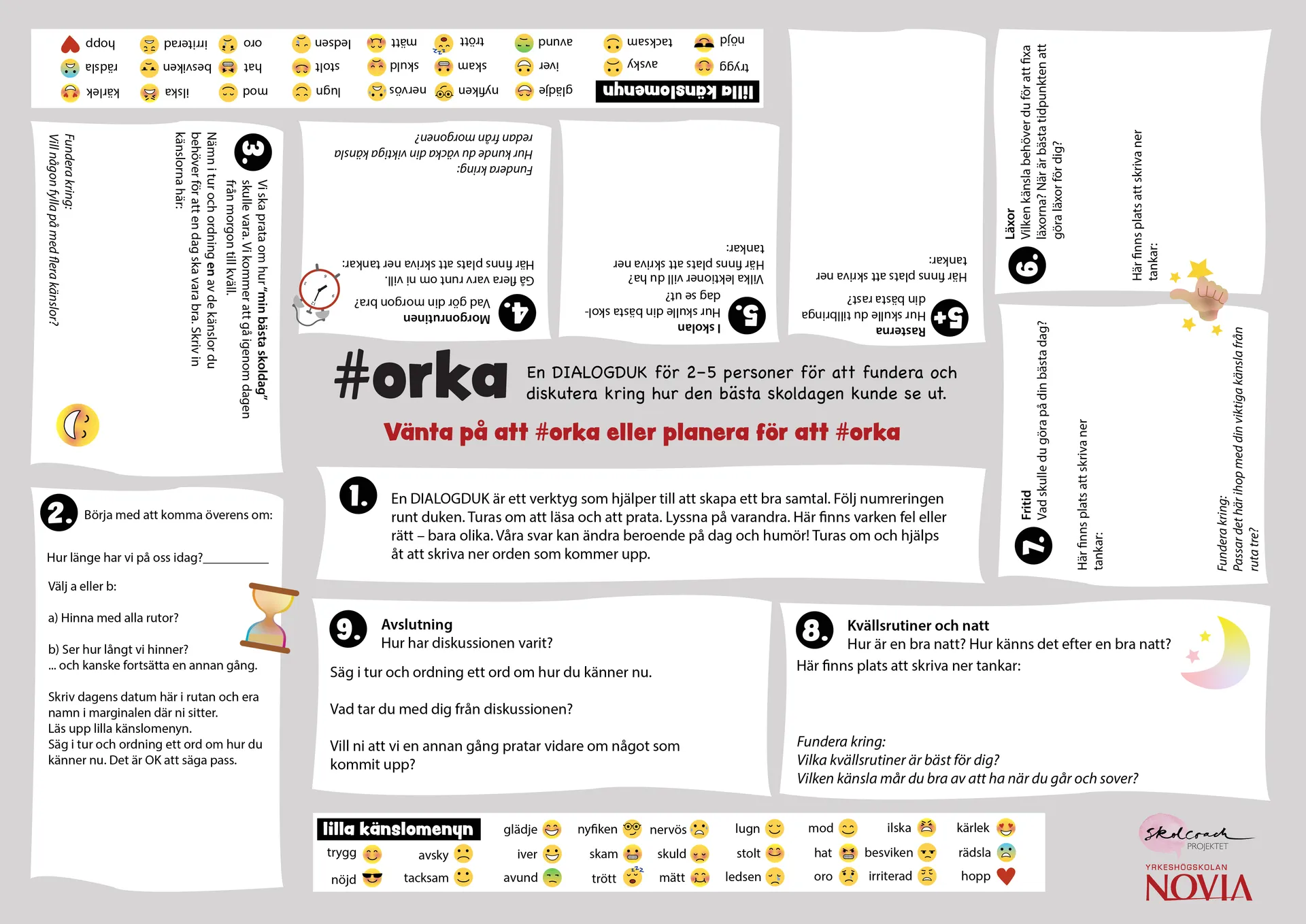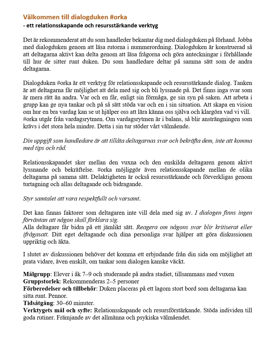 Du kan läsa mer om hur Dialogduken #orka kan tas i bruk i instruktionsarket nedan. Du kan också ladda ner själva duken i A3-storlek. Använd post it-lappar och pennor när ni antecknar svar på frågorna och diskuterar.