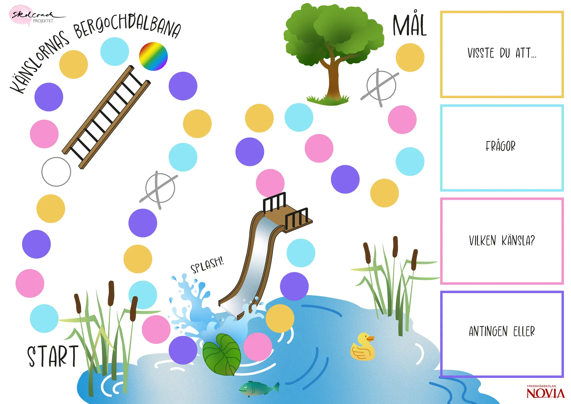 Känslornas berg- och dalbana är ett brädspel som ska inspirera och stöda eleverna att reflektera över känslor. De får överväga hur man handlar i olika situationer, svara på frågor kring känslor och ta del av kunskap om känslor. Spelet innehåller en spelplan och kategorikort. Spelpjäser och tärning får du låna från ett annat brädspel. Ladda ner materialet via länkarna nedan.